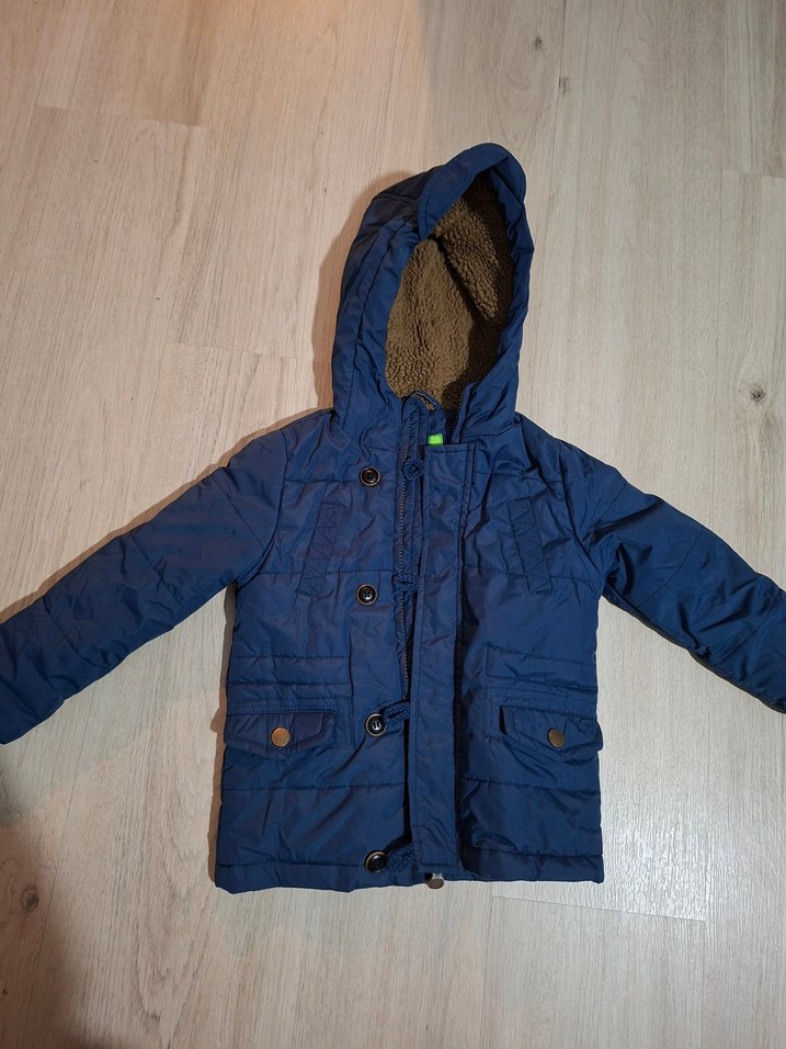 Erkek çocuklar için düğmeli, kapüşonlu ve notched yaka detaylı, koyu mavi renkli, yumuşak ve sıcak kumaştan üretilmiş mont.