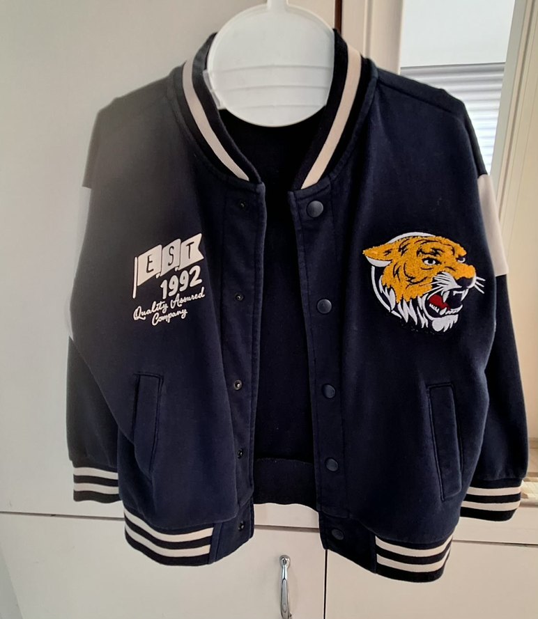Erkek çocuklar için düğmeli, bol kesim ve bisiklet yaka kolej ceketi. Yumuşak ve sıcak kumaştan, kaplan baskılı çok tarz.