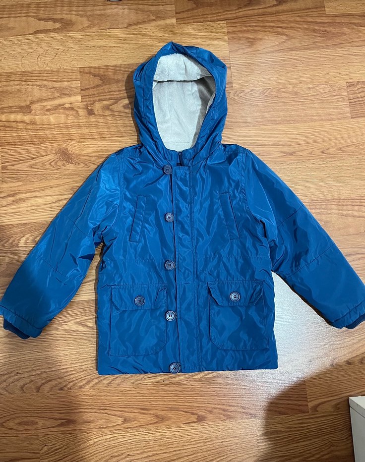 Düğmeli, kapüşonlu ve notched lapel yakalı erkek çocuk montu. Koyu mavi renkte, yumuşak ve su itici kumaştan yapılmıştır. Fermuarı dili yoktur düğmeli de kullanılabiliyor