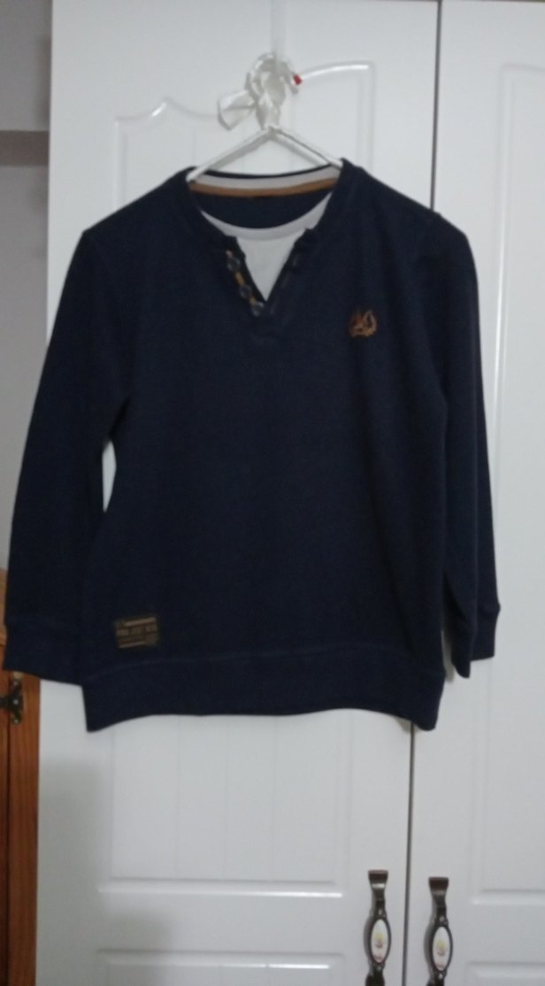 Uzun kollu, yuvarlak yakalı ve düğmeli koyu mavi erkek çocuk sweatshirtü. Rahat kesimi ve yumuşak sıcak kumaşıyla günlük kullanım için uygundur.