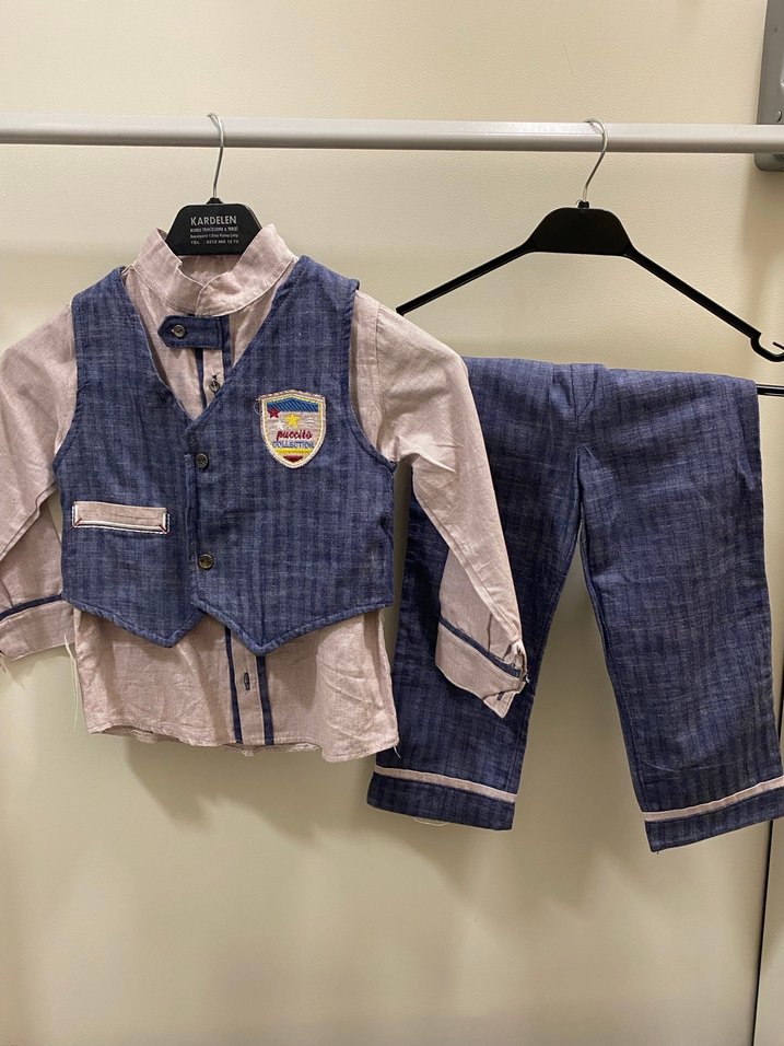 Düğmeli, yelekli, yakası kesikli erkek çocuk takımı. Yumuşak mavi tonlarda pantolon ve gömlekle tamamlanmıştır. Casual ve trend görünümlü. Etiketli yeni 1.5 yaş