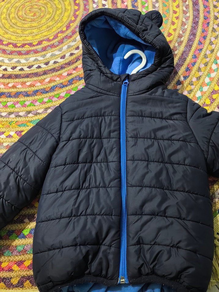 Erkek çocuklar için mavi fermuarlı, kapüşonlu, içi yumuşak ve sıcak astarlı, notched lapel yakalı, dar kesim sokak stilinde mont.