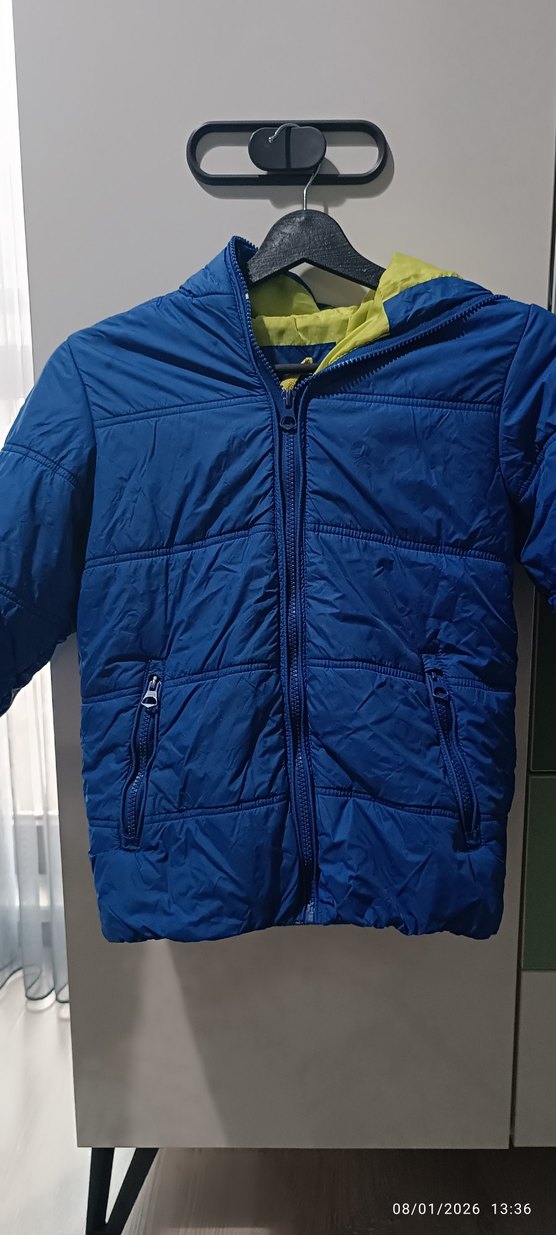 Parlak mavi renkte, fermuarlı ve kesimli yakalı, sokak tarzı erkek çocuk montu.