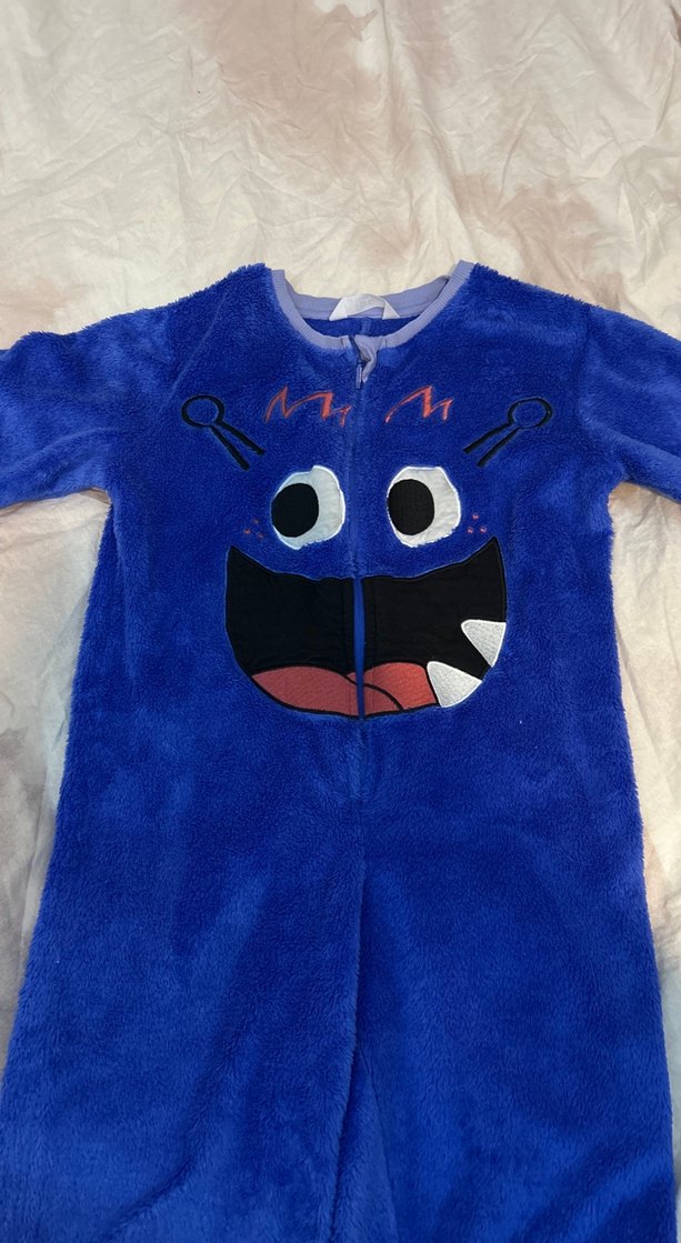 Erkek çocuklar için mavi, fermuarlı, fitted kesim pijama. Yuvarlak yaka, uzun kollu, önünde renkli nakışlı canavar yüzü bulunur.