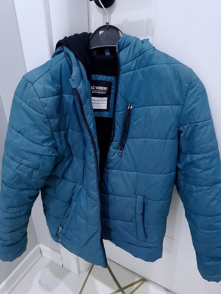 Erkek çocuklar için fermuarlı, yumuşak ve sıcak kumaştan yapılmış, fitted kesim mavi-gri renkli, notched lapel yakalı street wear mont. yan tarafında küçük bir söküğü var ama tamir edilebilir