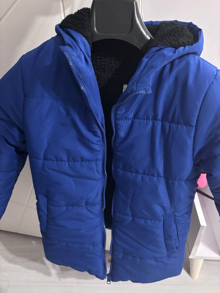 Erkek çocuklar için mavi, fermuarlı ve yumuşak dokulu polar kumaştan yapılmış, notched lapel yakalı, sade ve desen içermeyen street wear tarzında dar kesim mont.