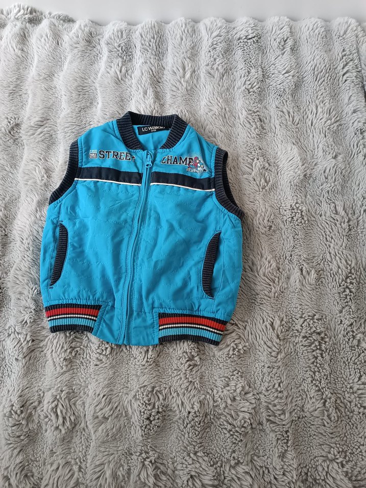 Erkek çocuklar için, renkli nakış detaylı, yakalı ve fermuarlı, kolsuz mavi yelek. Yumuşak ve sıcak kumaştan, rahat sokak stili için uygundur.