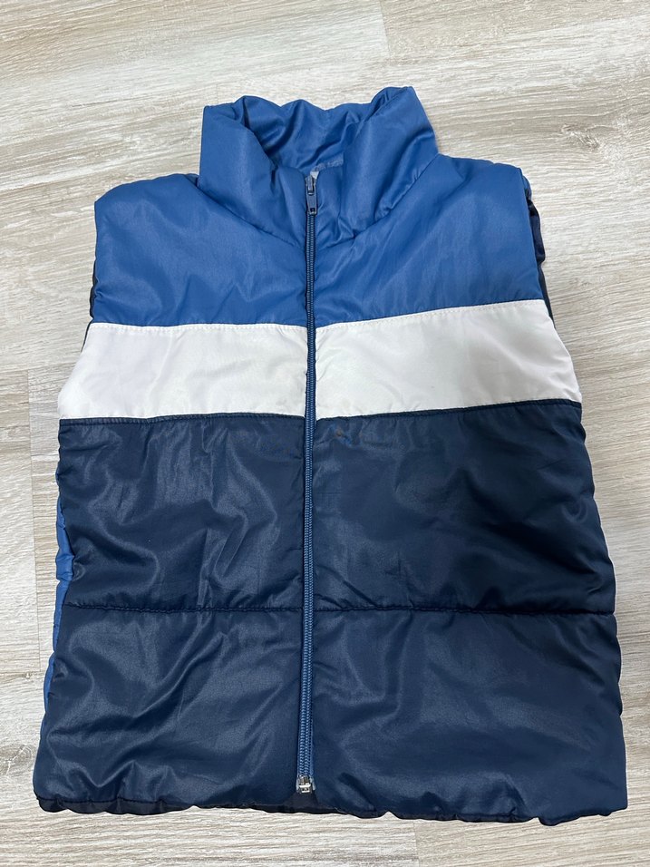 Erkek çocuk için fermuarlı, yakalı, kolsuz mavi yelek. Gri ve beyaz renk bloklu, dar kesim tarzda.