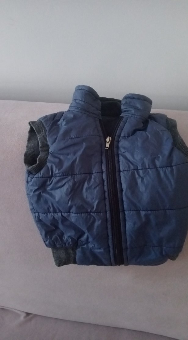 Erkek çocuklar için fermuarlı, boğazlı ve kolsuz mavi yelek. Yumuşak ve sıcak kumaştan, trend sokak giyimi tarzında, gri detaylıdır.