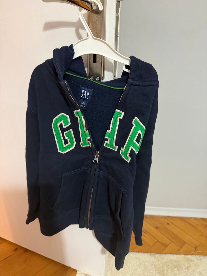 Koyu mavi renkli, fermuarlı ve uzun kollu erkek çocuk sweatshirtü. GAP baskılı, bol kesim ve yumuşak sıcak kumaştan, rahat sokak stili için uygun.