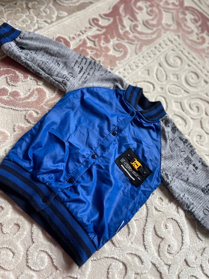 Düğmeli, yakalı ve bol kesim erkek çocuk ceketi. Mavi gövde ve baskılı gri kollardan oluşur, yumuşak ve sıcak kumaştan üretilmiştir.