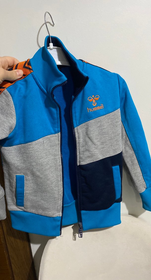 Erkek çocuk için mavi, gri ve lacivert panellerden oluşan, fermuarlı ve bisiklet yakalı, baskılı logolu, dar kesim sweatshirt.