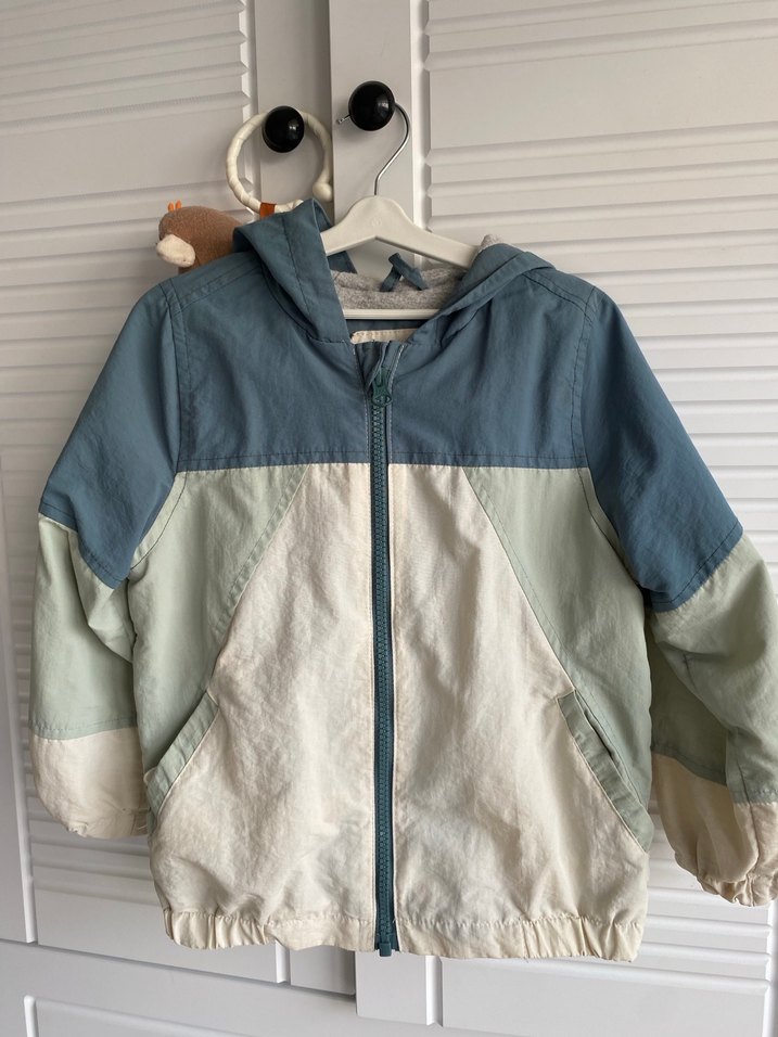 Erkek çocuk için bol kesim, fermuarlı ön kapamalı, yumuşak ve sıcak kumaştan yapılmış, mavi ve gri tonlarında yakası kesimli yağmurluk.
