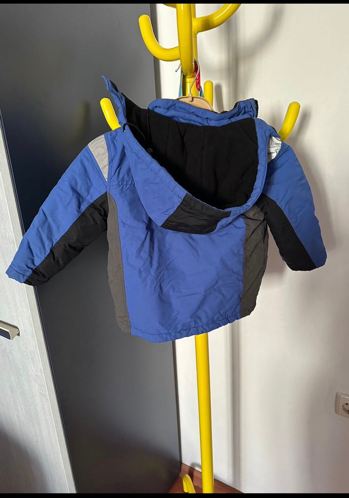 Mavi ve gri renklerde, kapüşonlu ve yaka detaylı, cırt cırtlı erkek çocuk montu. Yumuşak ve sıcak kumaştan, sokak tarzı için uygun.erkek çocuk için uygun.