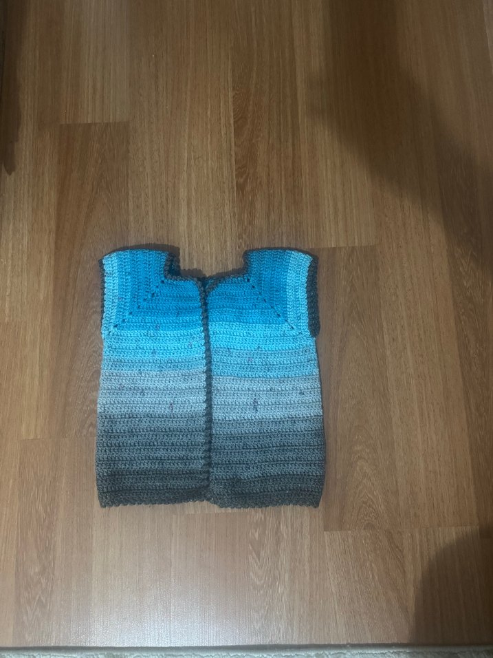 Erkek çocuk için mavi ve gri tonlarında, örgüden yapılmış, kolsuz ve çok renkli, salaş kesim yelek.
