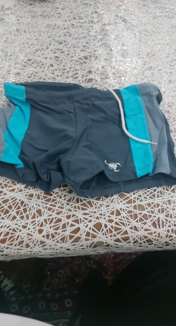 Mavi ve gri renklerde, bağcıklı erkek çocuk yüzme şortu. Rahat kesimiyle yüzme için uygundur.