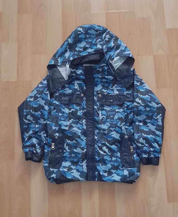 Erkek çocuklar için koyu mavi kamuflaj desenli, fermuarlı cepleri ve geniş kesimi olan sentetik kumaştan mont. Trendy ve rahat sokak stili için uygundur.