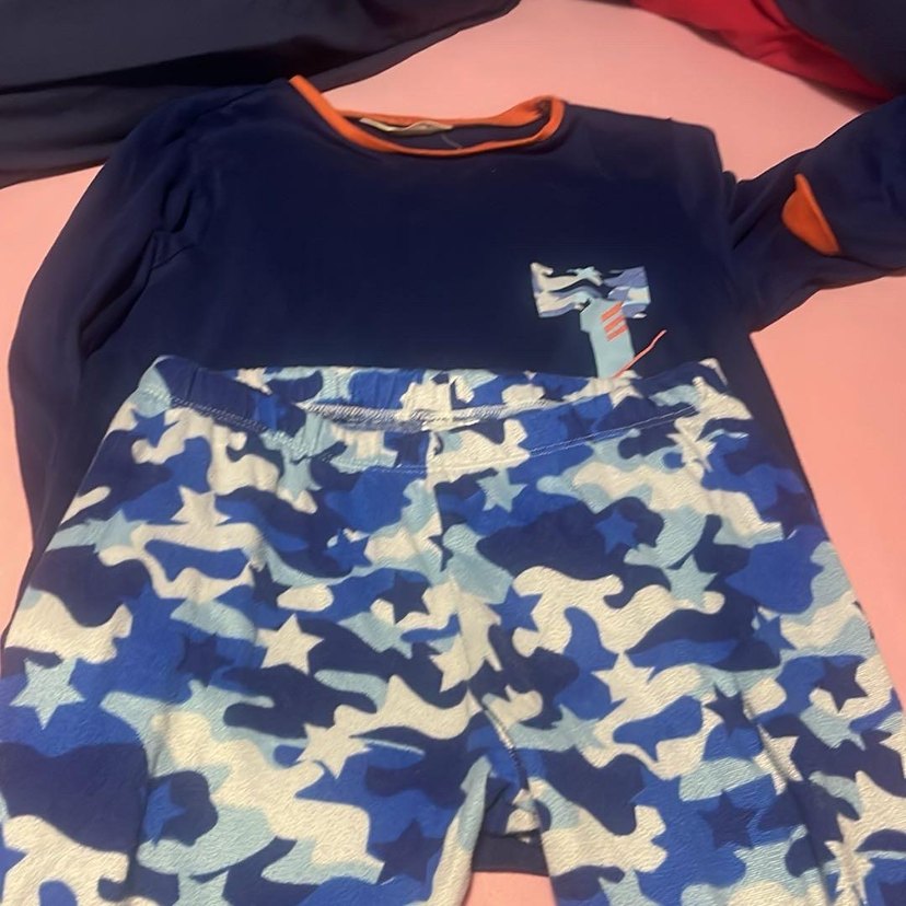 Erkek çocuklar için mavi kamuflaj desenli, kısa kollu, yuvarlak yaka termal pijama takımı
