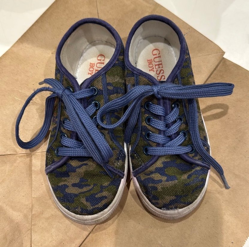 GUESS markalı, koyu mavi kamuflaj desenli, lastik tabanlı ve cırt cırtlı erkek çocuk spor ayakkabısı. Trend sokak stili için uygundur.