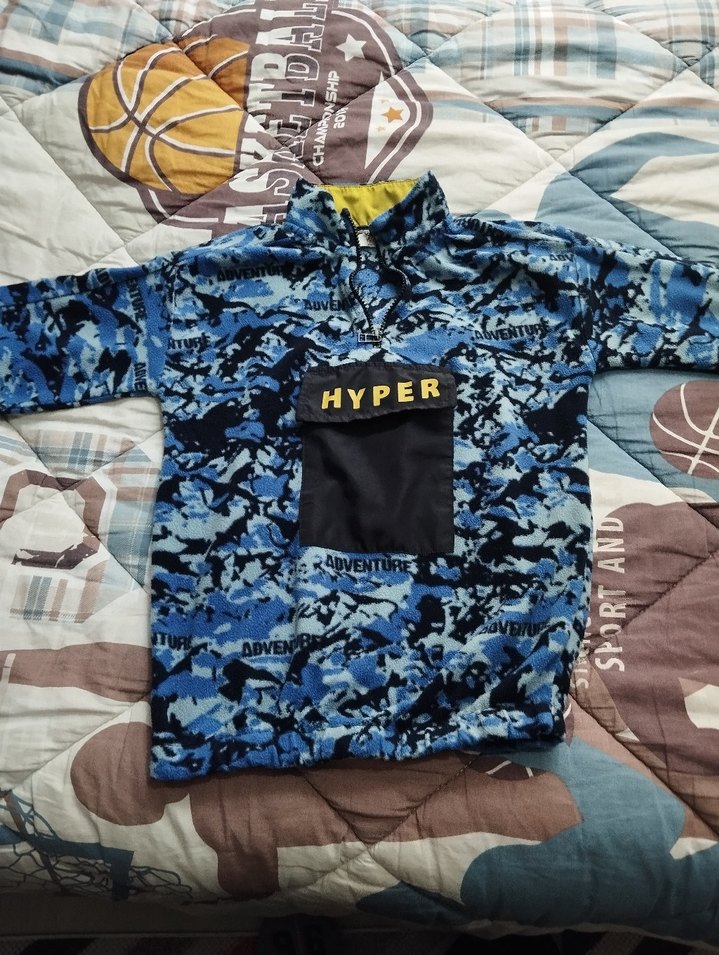 Erkek çocuklar için koyu mavi kamuflaj desenli sweatshirt. Yüksek yakalı, uzun kollu, bol kesim ve fermuarlı ön cep üzerinde 'HYPER' yazılı. Sentetik kumaştan, trend sokak stili için uygun.