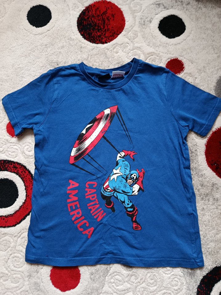 Pamuklu mavi, dar kesim erkek çocuk tişörtü. Kaptan Amerika baskısı ve düğme detayı bulunur. Kısa kolludur. minik bi delik var görsele ekledim renginde solma yok