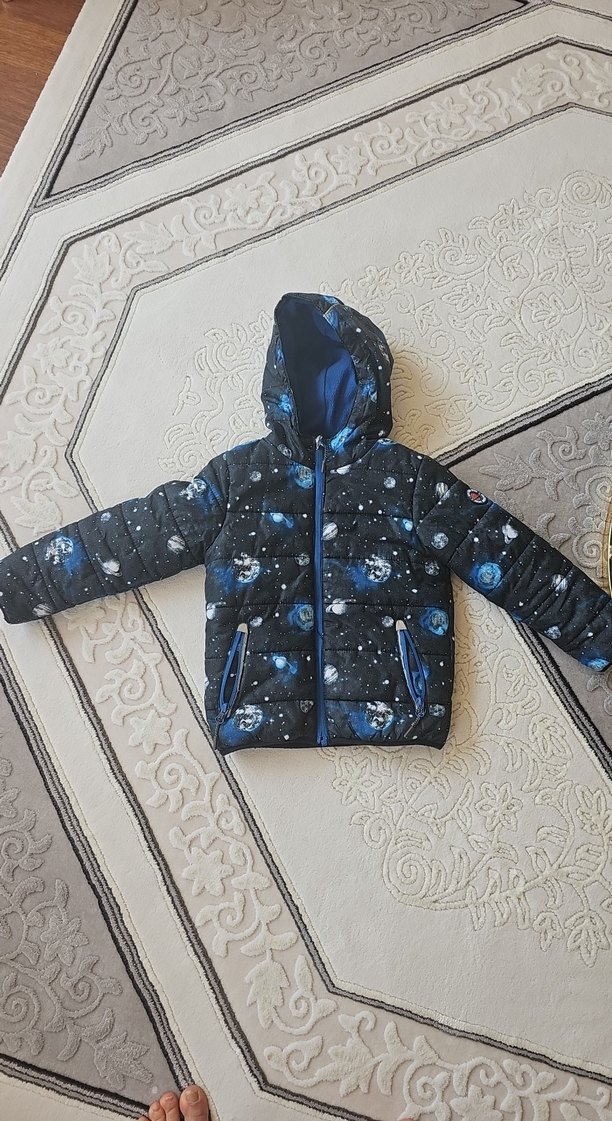 Erkek çocuklar için kapüşonlu, baskılı ve kürk detaylı mavi mont. İnce kesimi ve yumuşak dokusuyla sıcak tutar.