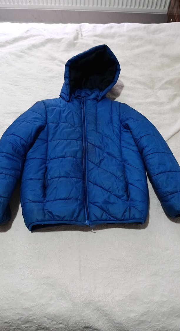 Erkek çocuklar için koyu mavi renkli, fermuarlı ve kapüşonlu, sade tasarımlı, yakalı, sıcak tutan yumuşak kumaştan yapılmış mont. kulanima bağlı kol manşet lerde lekeleri var yırtık vesaire Yok