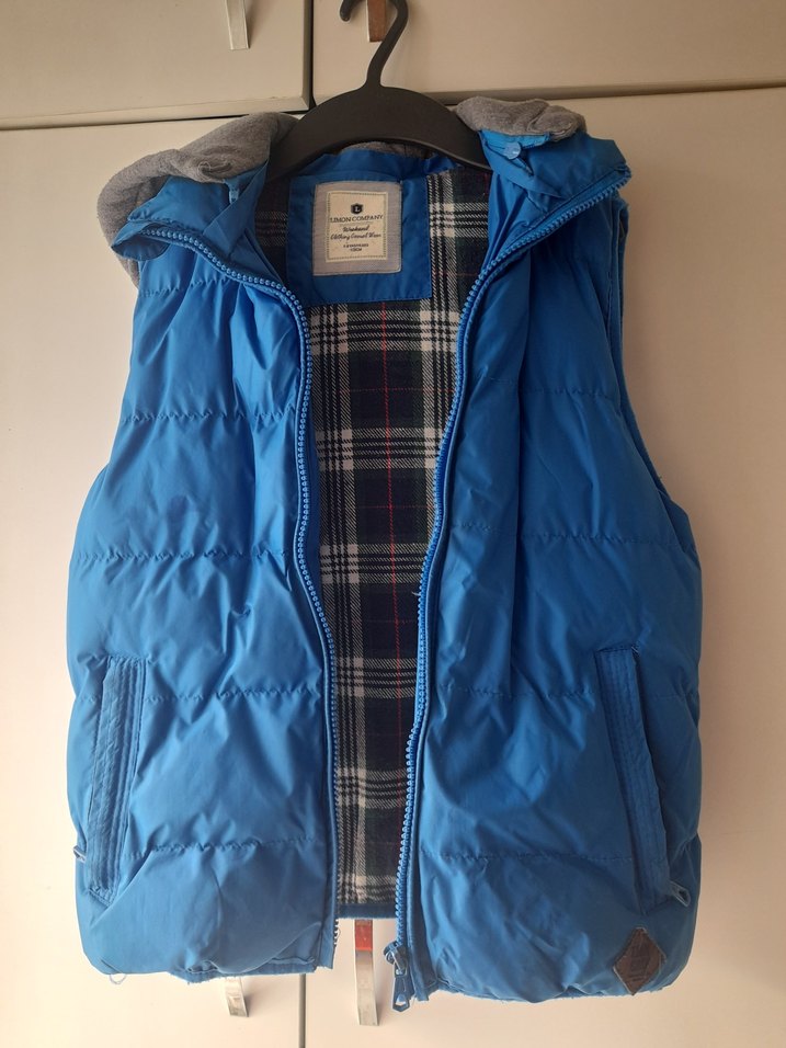 Erkek çocuklar için kapüşonlu, fermuarlı, fitted kesim mavi yelek. İç kısmı gri ekose desenli, yumuşak ve sıcak kumaştan üretilmiştir.