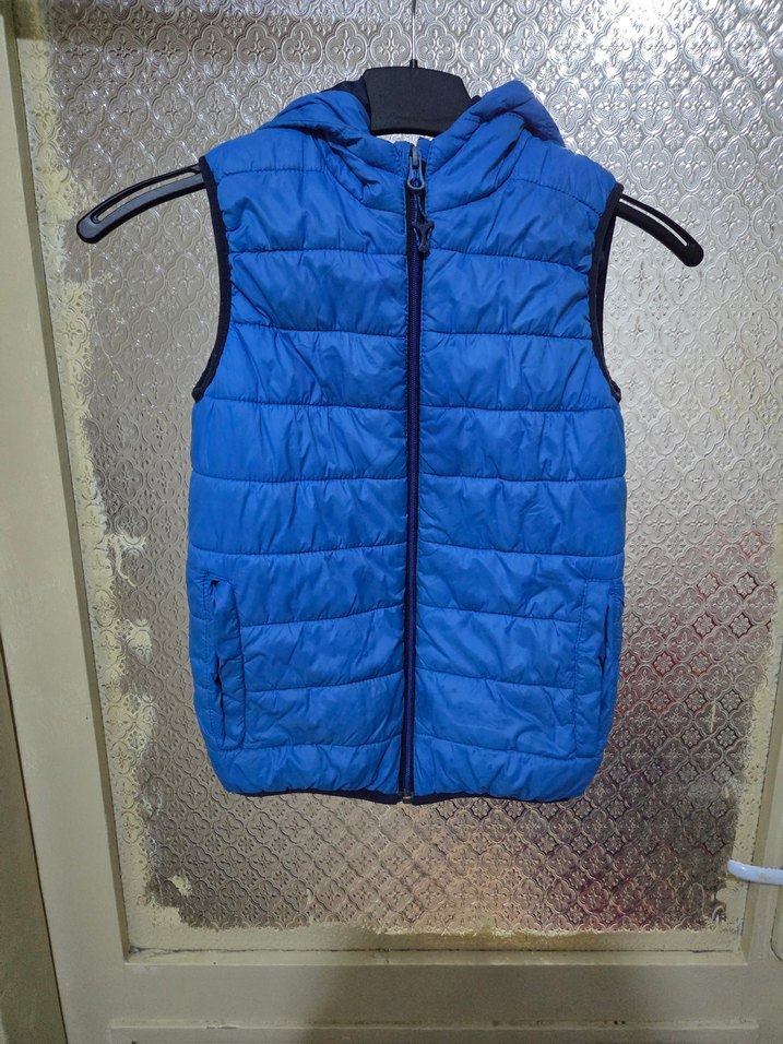 Erkek çocuklar için kapüşonlu, fermuarlı ve yakalı yelek. Kolsuz, yumuşak ve sıcak dokulu kumaştan üretilmiştir, canlı mavi renklidir.