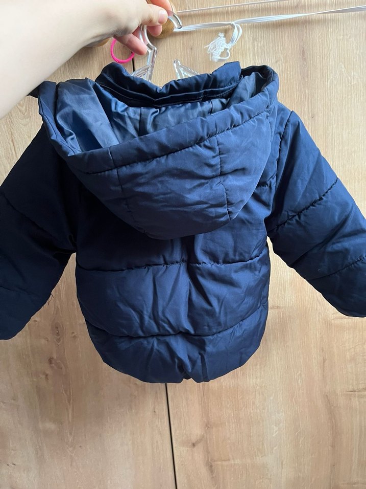 Erkek çocuk için düğmeli, kapüşonlu, mavi renkli, yumuşak ve sıcak kumaştan üretilmiş dar kesim mont. Sokak stili için uygun. Mont