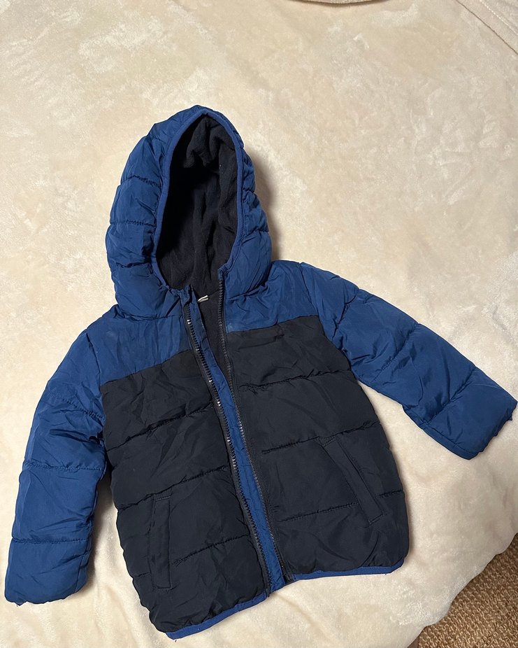 Erkek çocuklar için mavi ve siyah renk bloklu, kapüşonlu ve kürk detaylı, sıcak tutan ve sokak tarzı mont. Defo yoktur az kullanıldı