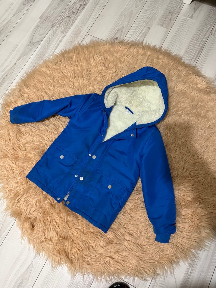 Erkek çocuklar için kapüşonlu, bol kesim mont. Yumuşak ve sıcak kumaştan, içi kürklü, parlak mavi renkli, sokak stili için uygun.