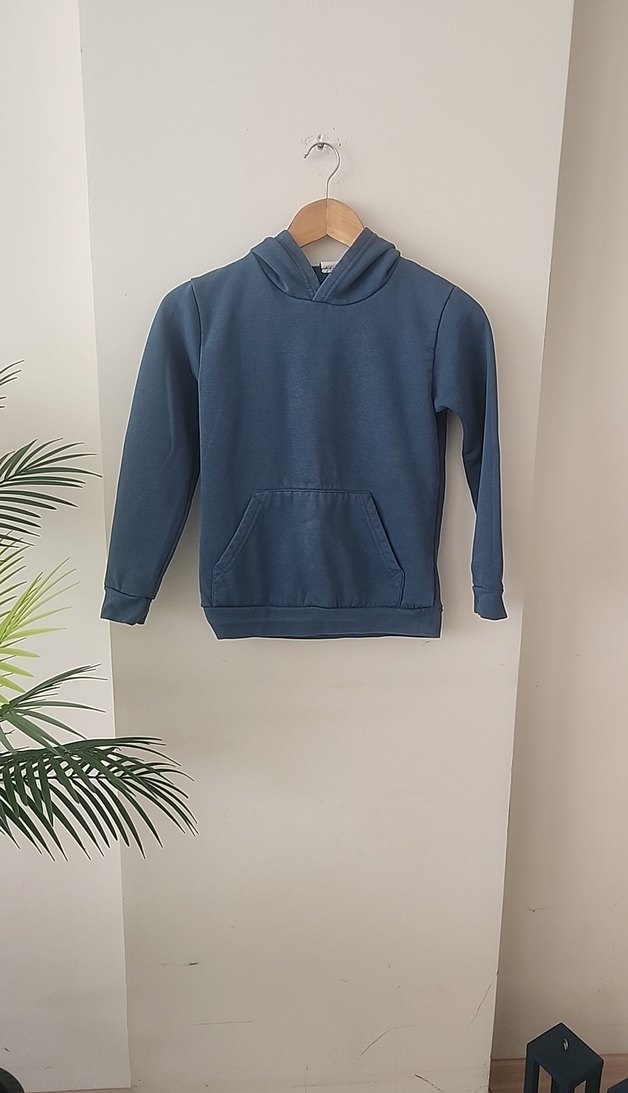 Erkek çocuk için mavi kapüşonlu sweatshirt, yuvarlak yaka ve uzun kollu. Yumuşak kumaştan, rahat ve sade tasarıma sahip.