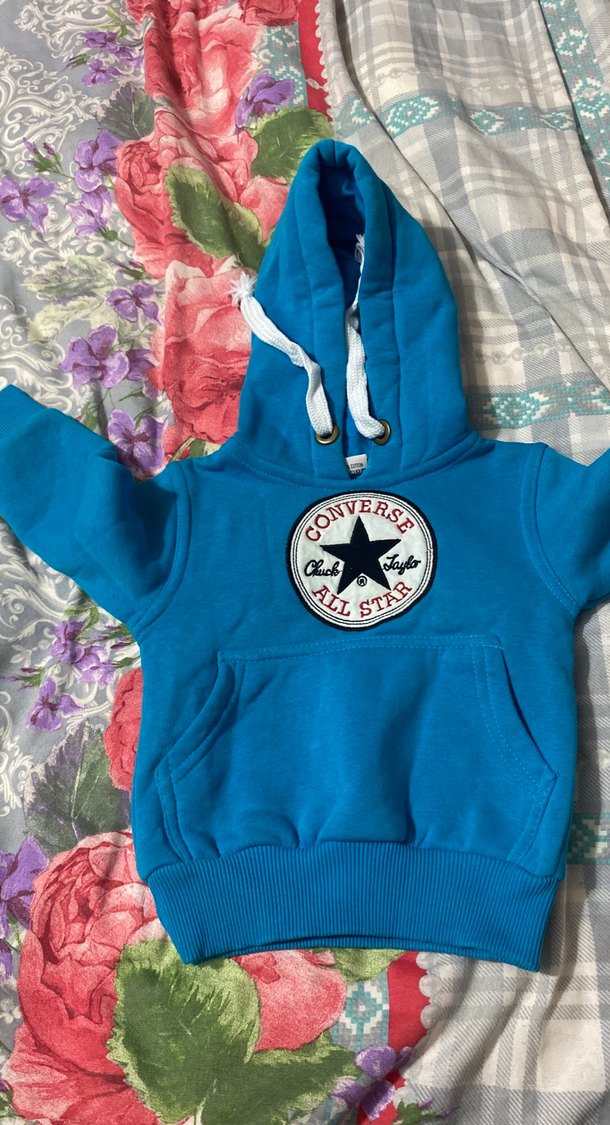 Erkek çocuklar için mavi kapüşonlu, uzun kollu ve önünde renkli Converse All Star logosu bulunan fitted sweatshirt. Önde cep ve beyaz ip detayları vardır.