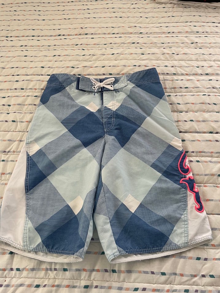 Mavi ve gri kare desenli, bağcıklı ve yan cepli erkek çocuk deniz şortu. Kırmızı işleme detaylı, rahat ve şık.ölçüleri verdim arkada minik bir leke var belli belirsiz çıkarmayı deneyecegim 10-11 yaşa uygun