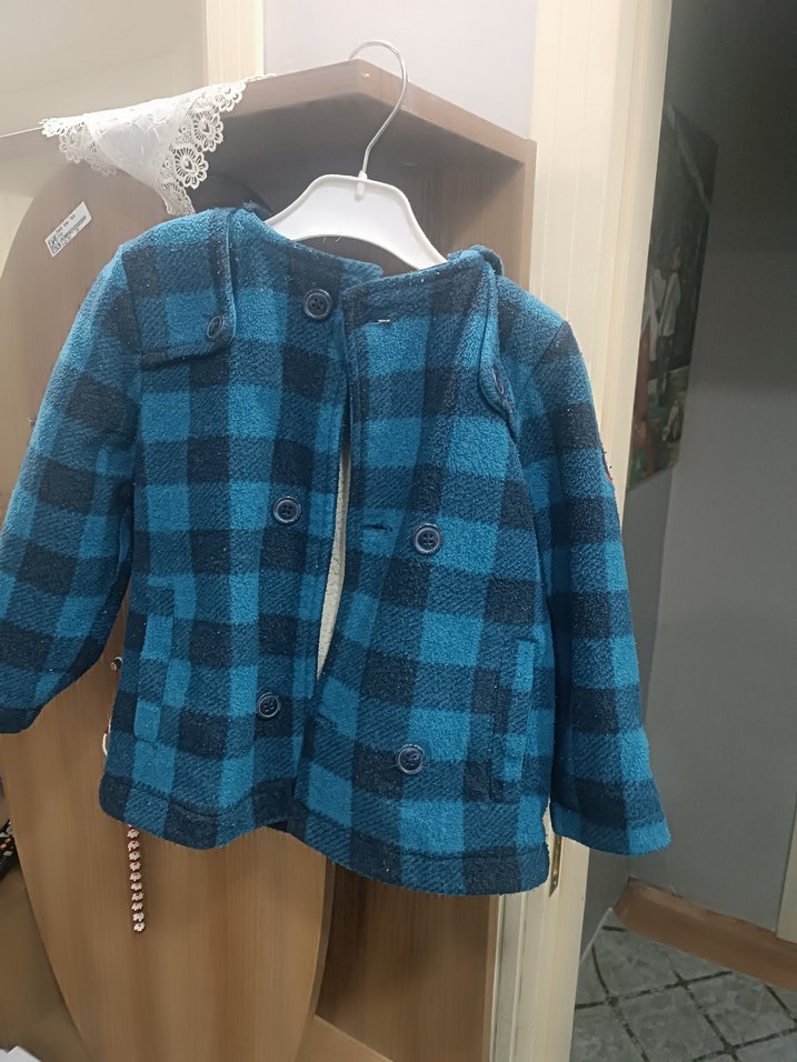 Erkek çocuk için mavi kareli, düğmeli, bol kesim ve yakası kesik detaylı, yumuşak ve sıcak kumaştan üretilmiş ceket. Rahat ve günlük sokak stili için uygundur.