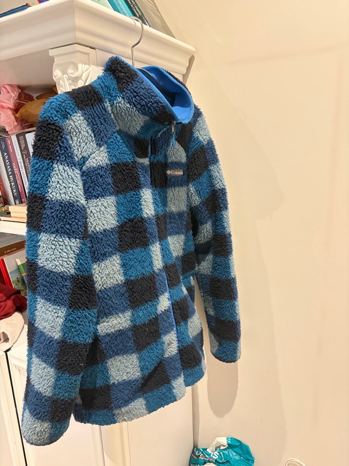 Erkek çocuklar için mavi ve gri kareli desenli, yüksek yakalı ve bol kesim yumuşak dokulu mont. Rahat sokak stili için uygundur. 11-12 yaş