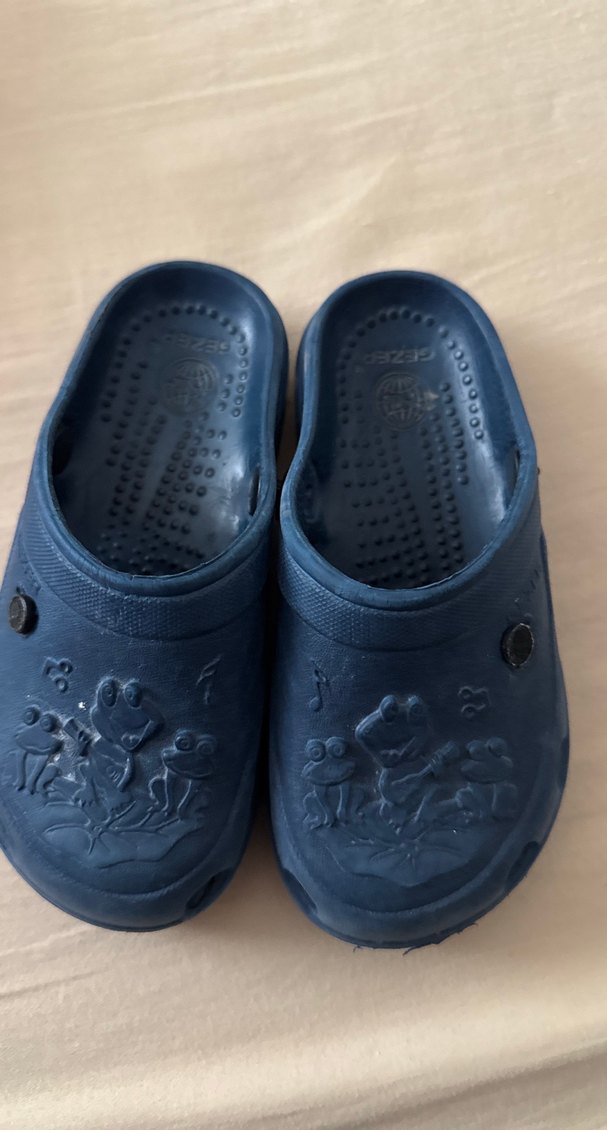 Koyu mavi kauçuk erkek çocuk terliği, tokalı ve üzerinde kurbağa desenli. Geleneksel tarzda, desensiz tabanlı.