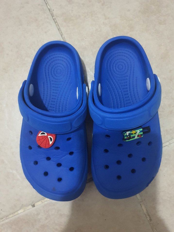 Mavi kauçuk erkek çocuk terliği, renkli nakış detayları ve kolay ayarlanabilir velcro kayışıyla sokak stili için uygundur.