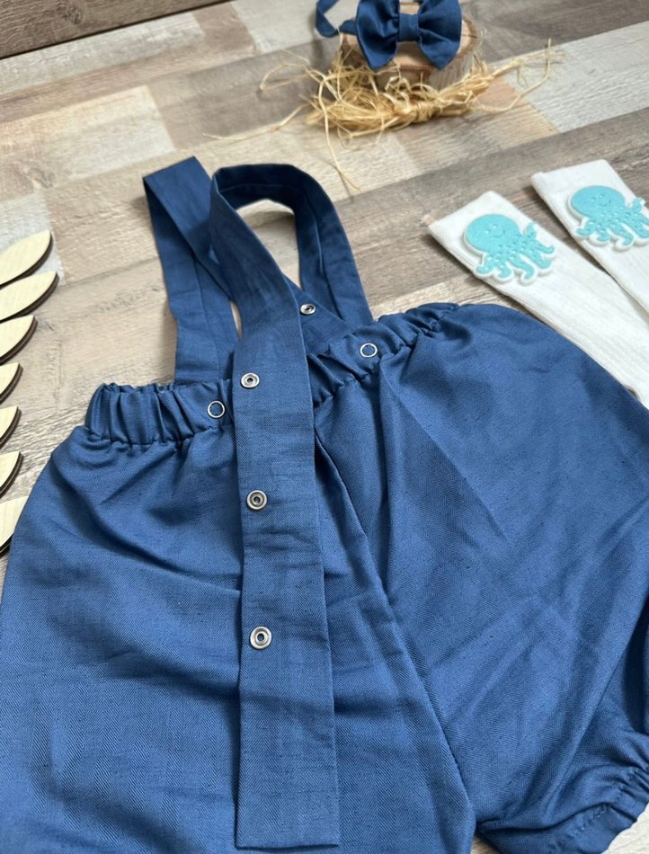 Yumuşak keten kumaştan, çıtçıt askılı, bol kesim erkek çocuk mavi tulum, bohem, denizatı ve 1 rakamı iğneli rozet şeklinde çıkabilir
