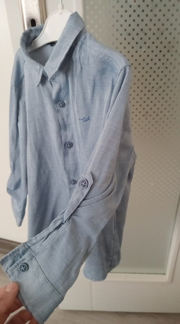 Erkek çocuk için keten kumaştan üretilmiş, düğmeli, uzun kollu, yaka kısmı kesik detaylı, salaş kesim mavi gömlek.