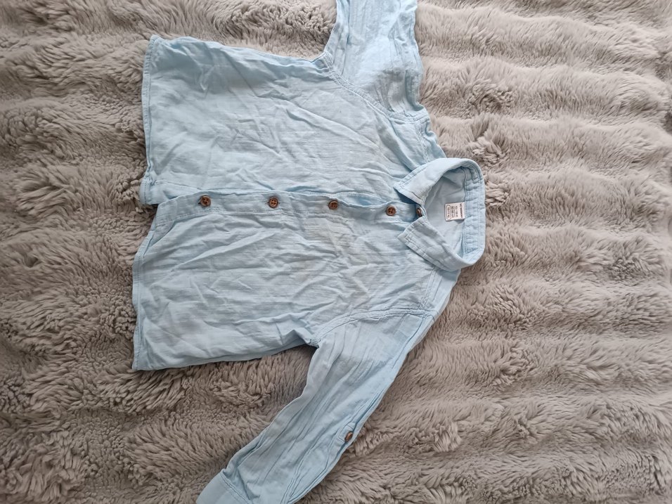 Erkek çocuk için açık mavi keten kumaştan, düğmeli, uzun kollu, yakalı ve bol kesim gömlek. Desensiz ve rahat kullanıma uygun.