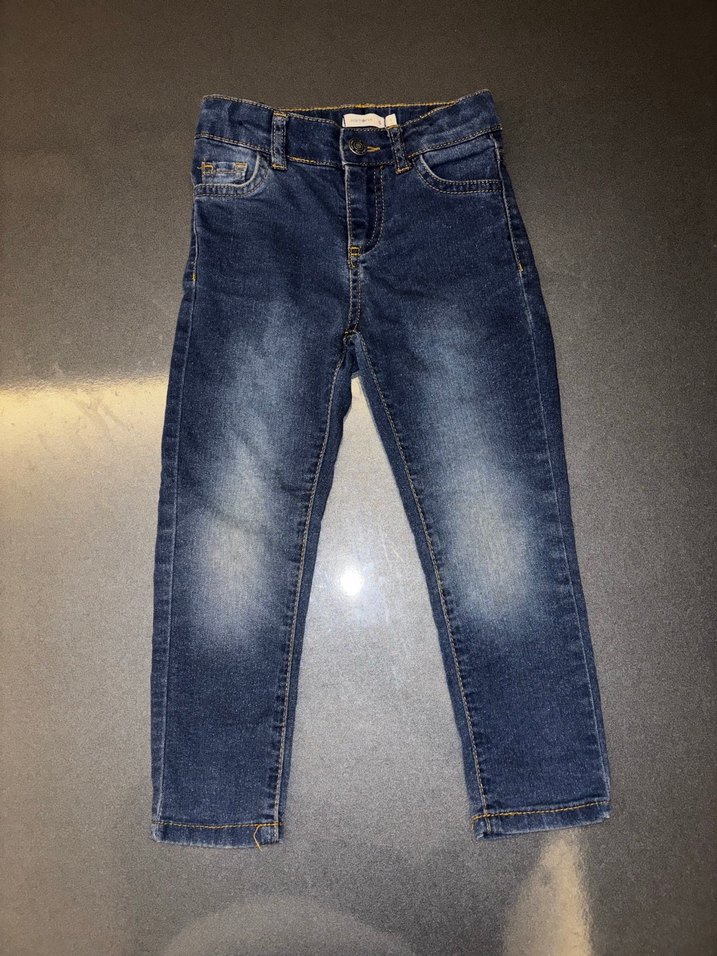 Erkek çocuklar için mavi kot pantolon, normal kesim ve tokalı detaya sahip, sade normcore tarzında. Günlük kullanıma uygun. 3-4 yaş sorunsuz