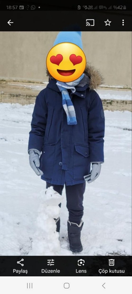 Mavi renk, kürklü kapüşon ve kesik yakalı, erkek çocuklar için sıcak ve yumuşak dokulu kışlık mont. Sokak stili için uygun, dar kesim.cep kenarları yıpranmış ama yırtığı felan yok resimdeki gibi
