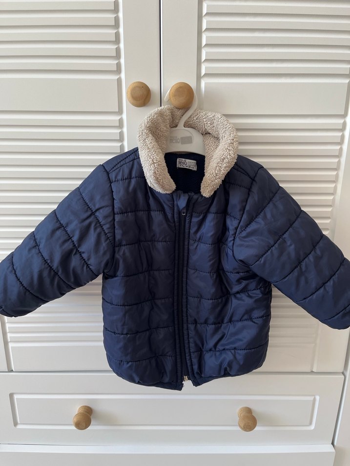 Erkek çocuk için mavi, düz renkli, kürklü yakalı ve sıcak fleece kumaştan yapılmış, dar kesim mont.