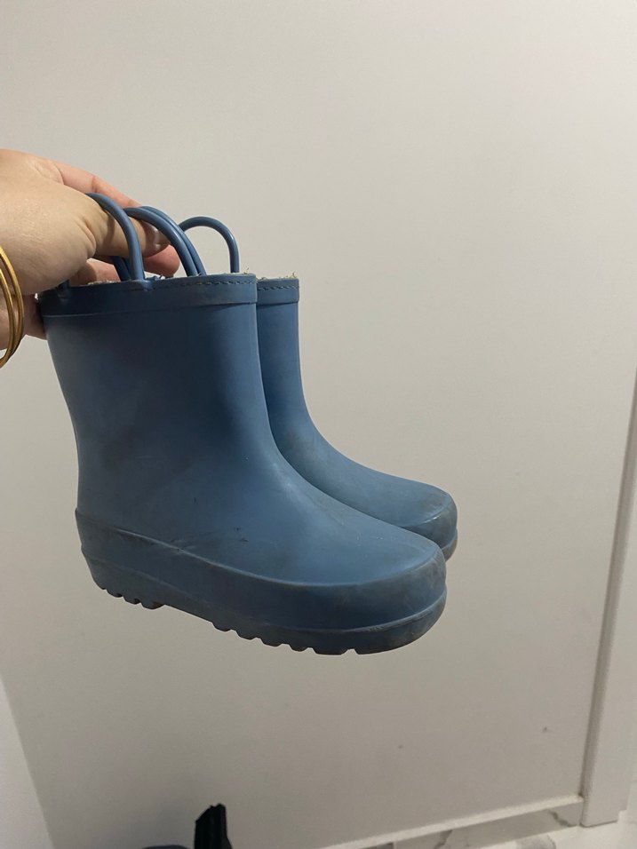 Erkek çocuklar için dayanıklı lastikten yapılmış, mavi sade çizme. Kolay giyme için tutma kulpları bulunur. Bir sezon kullanıldı yepyeni .