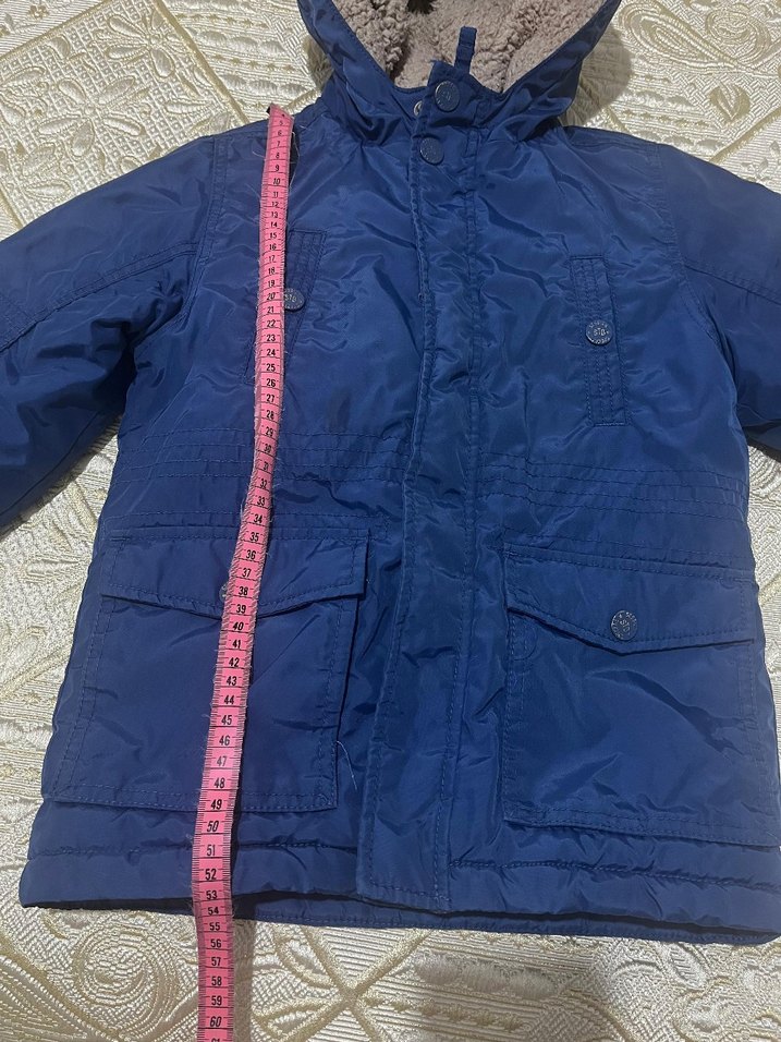 Düğmeli, kesimli ve koyu mavi renkte, sıcak tutan polar kumaştan yapılmış erkek çocuk montu. Sokak stili ve çoklu ceplere sahip.