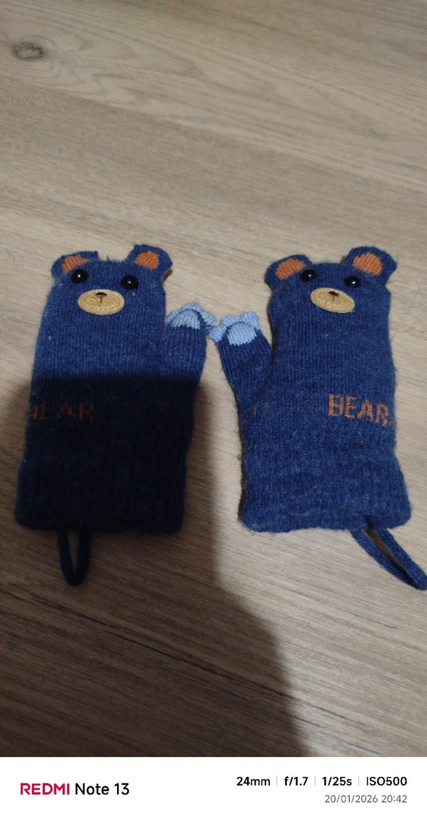 Koyu mavi örgü erkek çocuk eldiveni, nakışlı ayı figürlü ve yumuşak kumaşlıdır. Her eldivende 'BEAR' yazısı işlenmiştir. içi peluş tüylü yumuşak