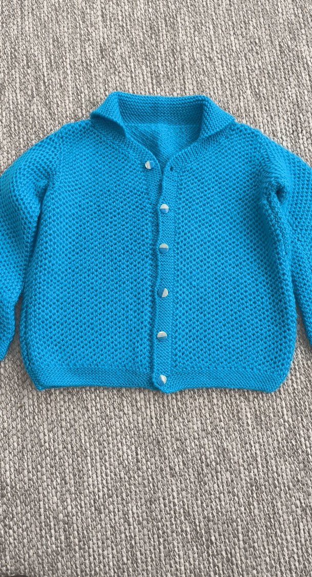 3/4 yaş için Mavi renkli, örgü kumaştan yapılmış, uzun kollu ve bol kesim erkek çocuk hırkasıdır. Düğmeli ve desensiz sade bir tasarıma sahiptir.