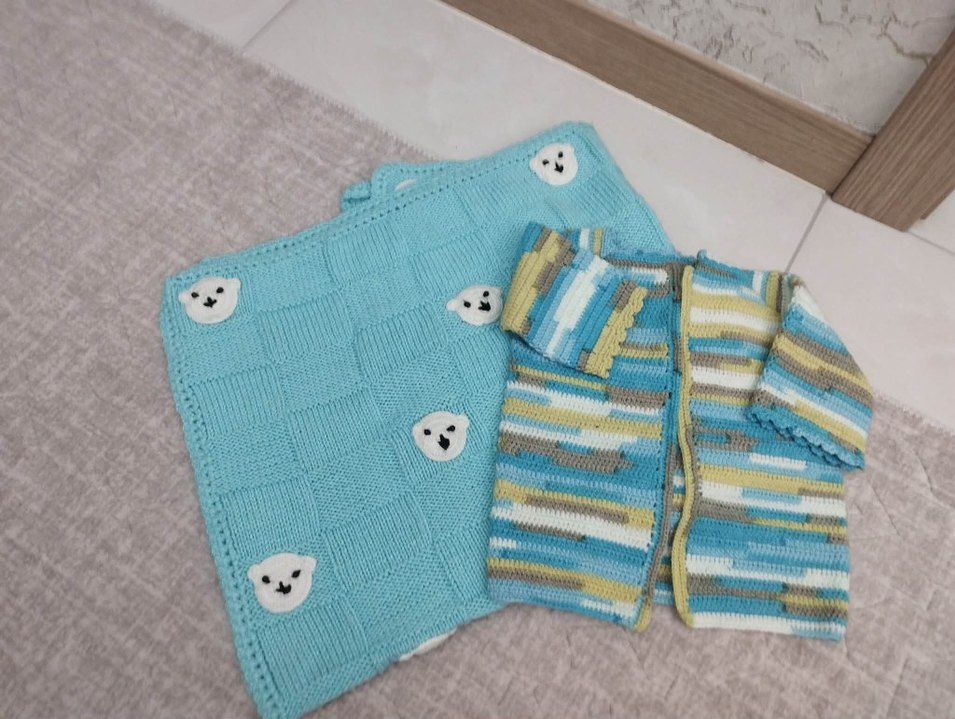 Erkek çocuklar için uzun kollu, regular fit mavi örgü hırka ve ayıcık desenli mavi battaniye seti.